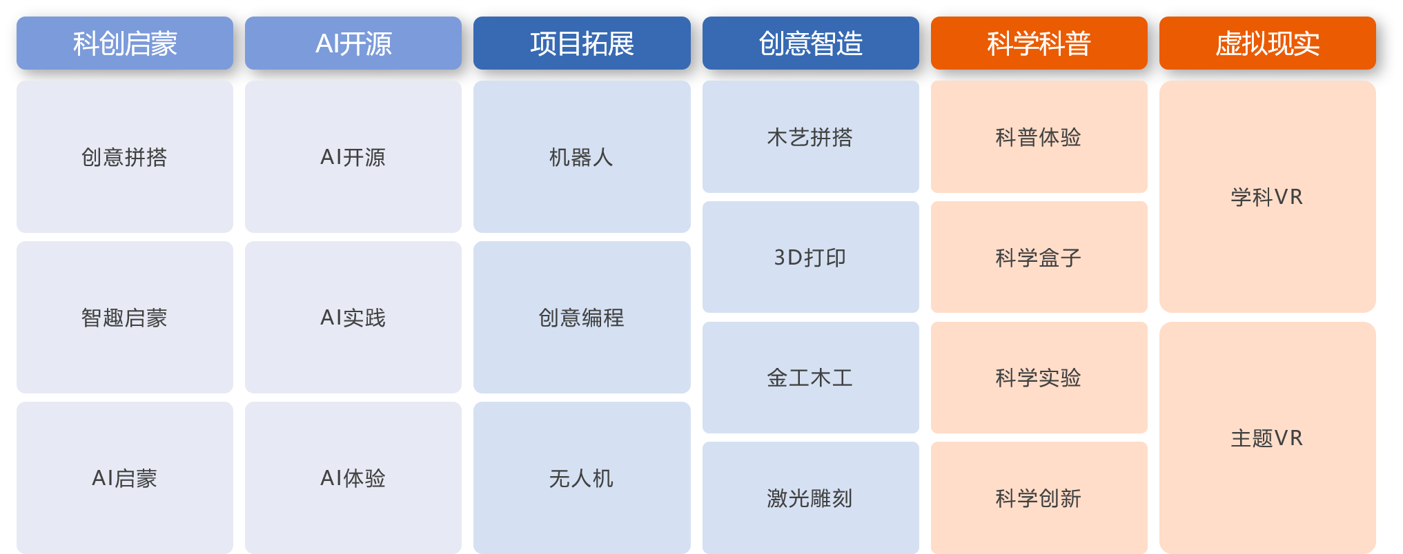 从空间到内容,打造校园科创核心引擎:聚焦三大核心场景、定制化解决方案。对标前沿课程标准、结合本土教育需求,硬件、课程、平台、高性价比全链路服务,降低课程落地门槛。